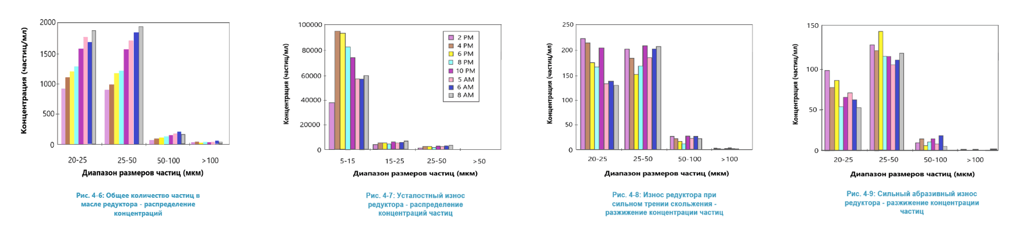 На рис. 4-6 показаны гистограммы общих концентраций частиц различных диапазонов. Соответствующие столбики гистограммы в четырех диапазонах размеров взяты из одной пробы. Пробы масла отбирались во время испытания последовательно, как показано на рисунках. Аналогичный набор данных для частиц, классифицируемых как результат усталостного износа, сильного трения скольжения и абразивного износа, показан на рис. 4-7, 4-8 и 4-9, соответственно. Все концентрации частиц скорректированы с учетом разбавления жидкости, поскольку уровень масла в редукторе был доведен до уровня чистого масла при замене каждой взятой пробы.