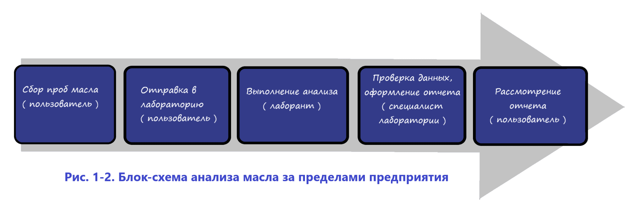 Также распространено привлечение услуг сторонних лабораторий для проведения анализа масла. Ежегодно сотни миллионов проб масла анализируются лабораториями по всему миру. Анализ масла в сторонних лабораториях включает в себя сбор проб масла на объекте и их отправку в лабораторию. После этого лаборанты проводят необходимые исследования масла в зависимости от типа оборудования, а специалист по анализу просматривает данные и дает рекомендации, включаемые в окончательный отчет. Оформленный отчет отправляется обратно пользователю на рассмотрение; при необходимости, выполняются действия по техническому обслуживанию на основе указанных в отчете рекомендаций и графика технического обслуживания (рис. 2).