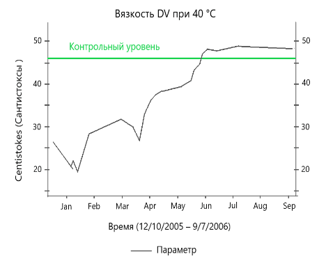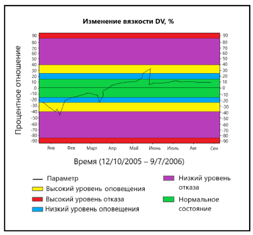 Используя прибор Spectro Q5200 Trivector, компания сначала анализировала только вязкость масла. На представленных ниже графиках кинематическая вязкость составляет 27 сСт при 40 °C, а процентное изменение KV на уровне срабатывания аварийной сигнализации находится между синим и желтым цветовым кодом.