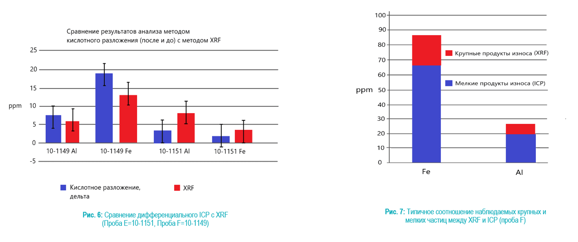 На рис. 7 показана разница в миллионных долях между показаниями ICP и XRF для Fe и Al в пробе F. Это ожидаемый результат, основанный на том, как крупные и мелкие частицы ведут себя в системе смазки с замкнутым контуром. Крупные частицы выводятся из системы и отфильтровываются гораздо легче, чем мелкие частицы, которые никогда не выводятся из системы и продолжают наращивать концентрацию.