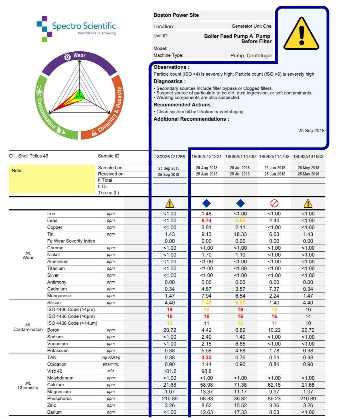 Предоставляет полный отчет об анализе масла с предоставлением результатов элементного анализа, всестороннего анализа частиц износа, загрязнения твердыми частицами и водой, химического состава и вязкости жидкости. Идеально подходит для крупных электростанций и производственных предприятий с большим количеством оборудования.